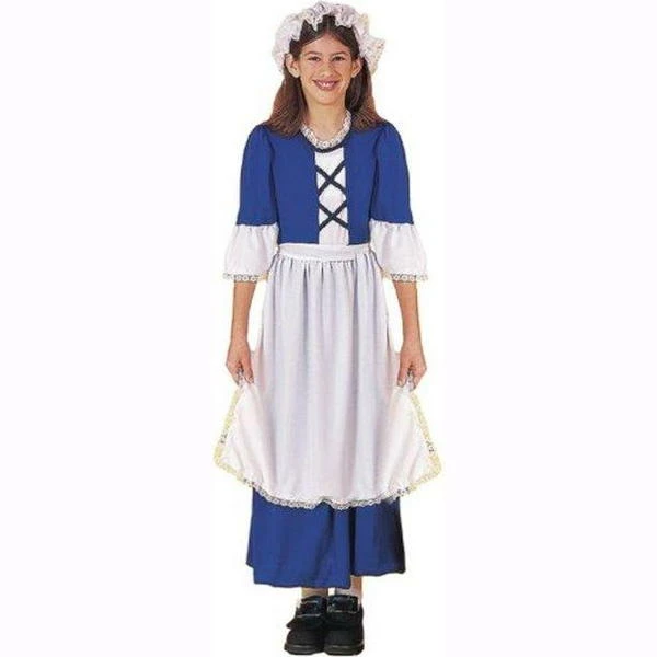 The colonial girl’s costume includes the blue and white dress with white apron and matching hat. The colonial costume is great for school plays, Independence Day parades, Presidents Day, Halloween, and more.