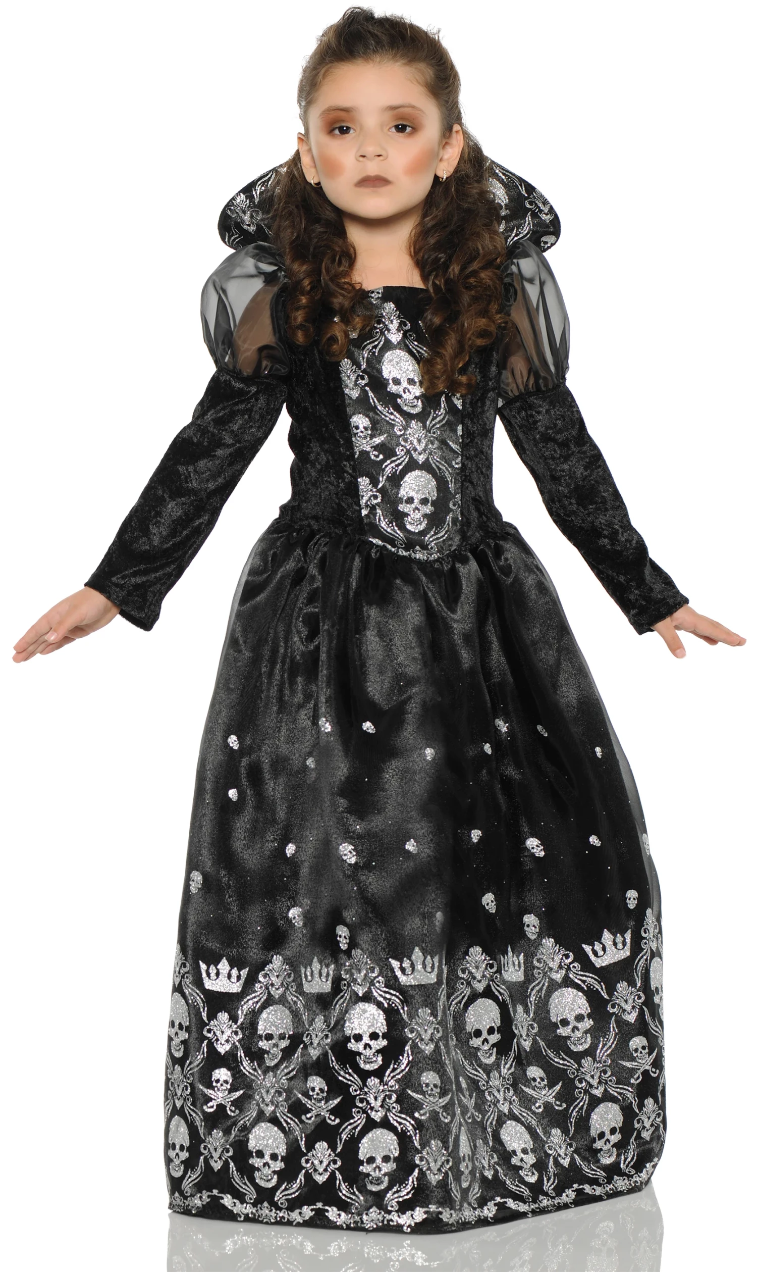 The dark princess dress is a perfect gown for her Halloween costume or a Day of the Dead celebration! Full-length black and white dress with glitter printed organza overlay with attached raised collar. Matching skull print design on inside of raised collar, on bodice insert and on bottom of skirt. Let her enjoy a fang-tastic Halloween with her friends in this dark princess costume this year!