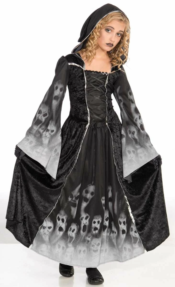 The forsaken souls dress is black and grey with pictures of all of the souls already taken. Bell style sleeves and silver trim accent the forsaken souls costume.