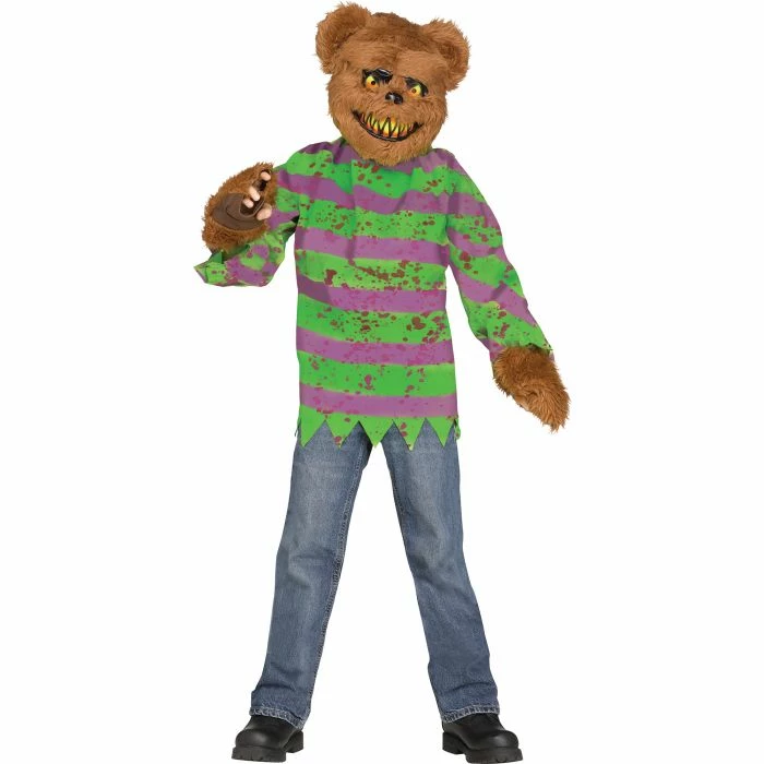 Definitely not a cuddly teddy bear. Beware of the Killer Brown Bear! Blood splattered stiped shirt, Plush Mitts and Furry Plush Brown Bear Mask. Child size
