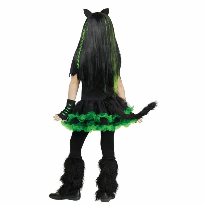 Black and Green Kool Cat dress with cast tail, glovelets, footless tights and headband with ears. Child Size