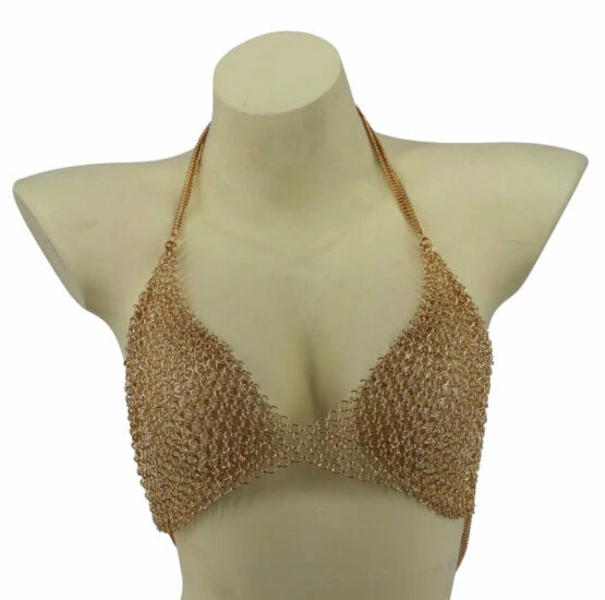 This gold Chainmail top is ready to wow your friends with its sizzling style and make you the envy of any festival, rave or Renaissance party! Get ready to make a statement with this metal chainmail bra – only top included!