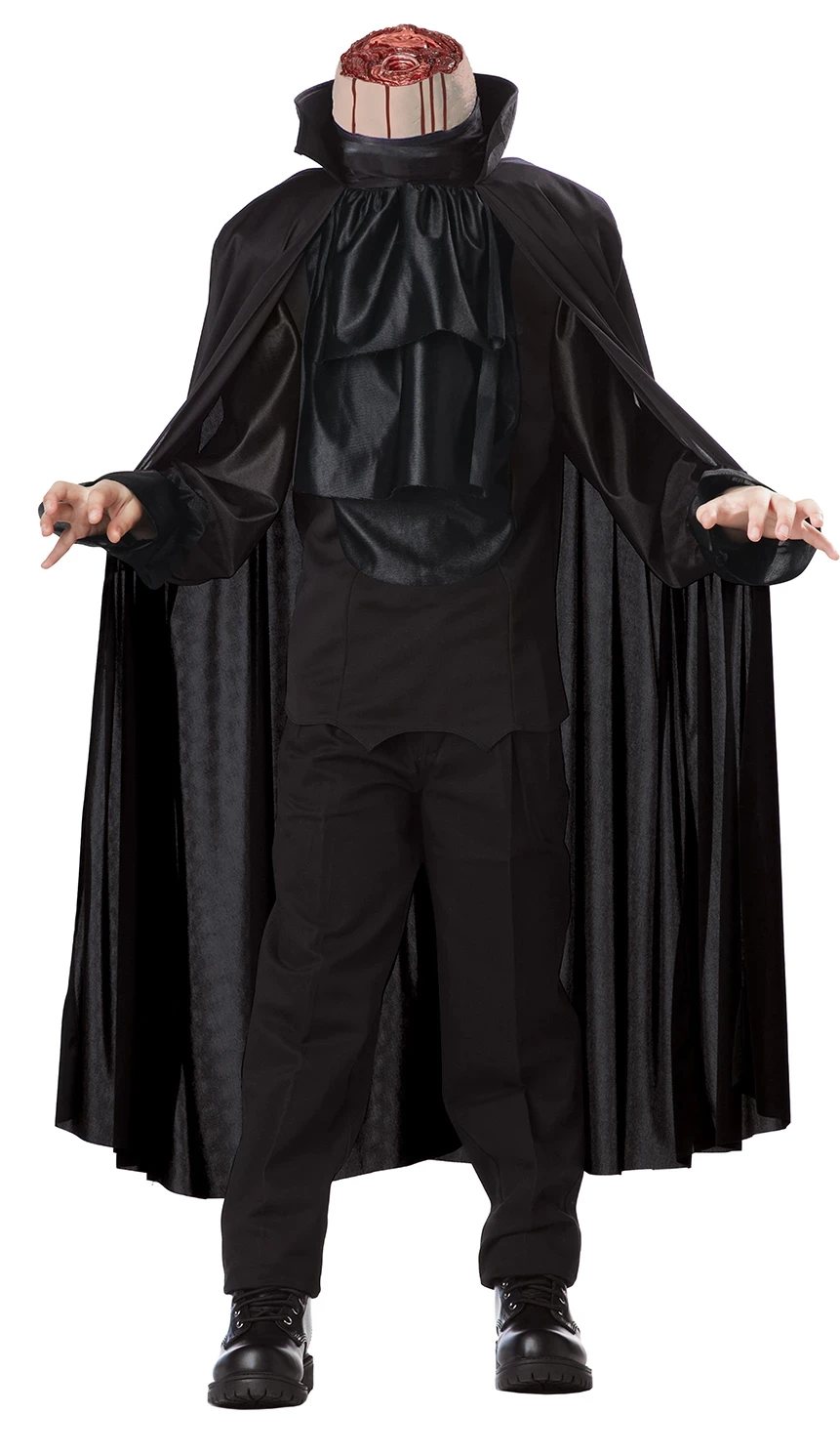 Sleepy Hallow has a little secret it wishes not to tell. The Headless Horseman costume includes vest with attached ascot and cape, headpiece and inflatable shoulders. The headless illusion is created by a raised shoulder piece, a neck piece that sits on top of head, and a see through fabric which hides the eyes.