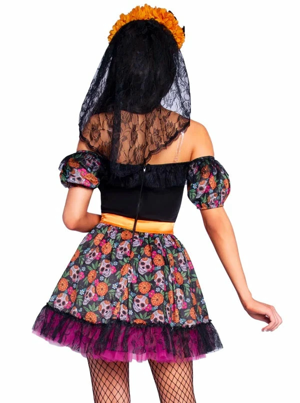Look great for Halloween or Day of the Dead celebrations with the Marigold Catrina costume. This 2-piece set includes a sugar skull dress with lace trim and a marigold and butterfly headpiece with a lace veil. Perfect when paired with hosiery and makeup to complete the look.