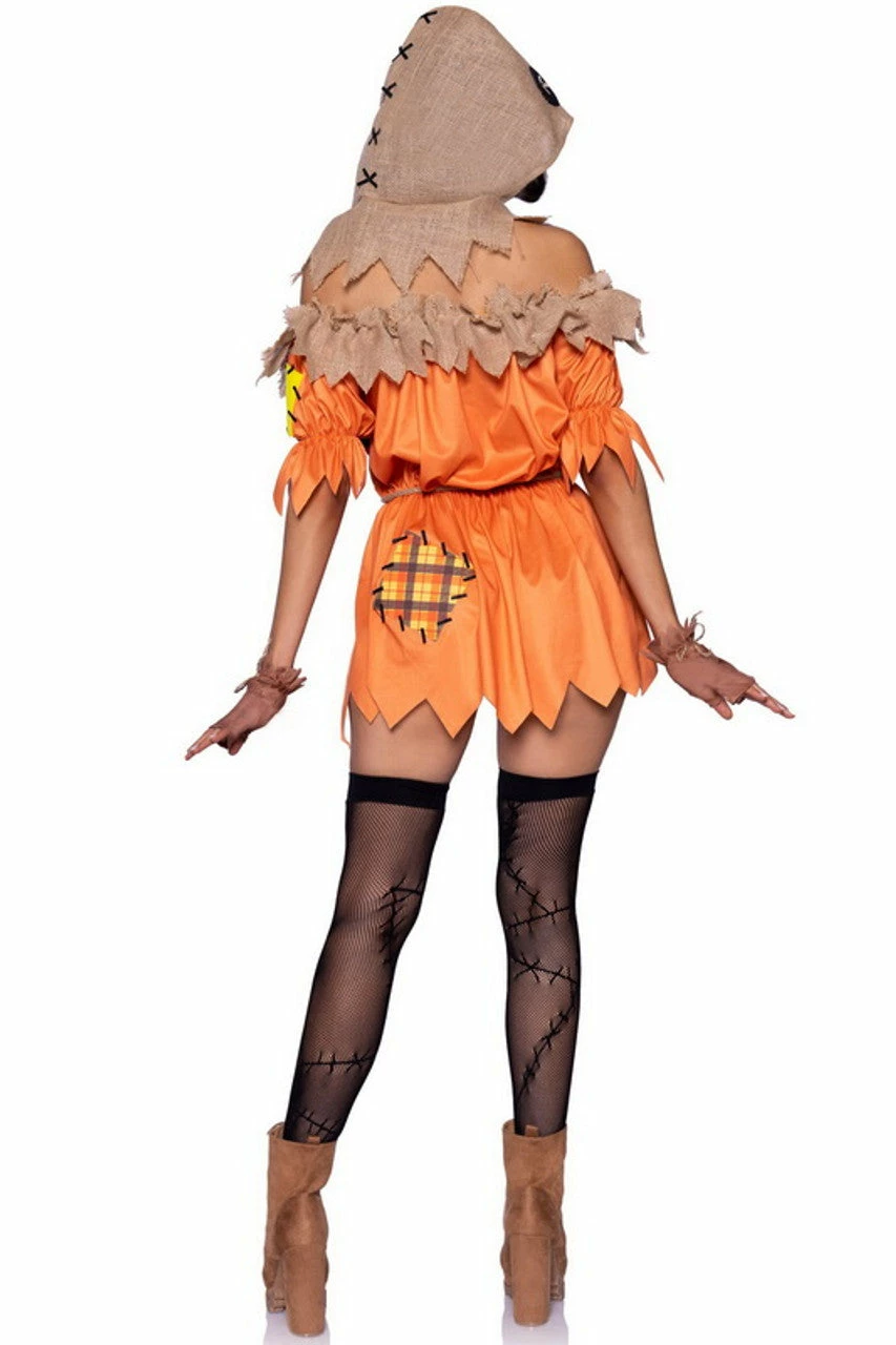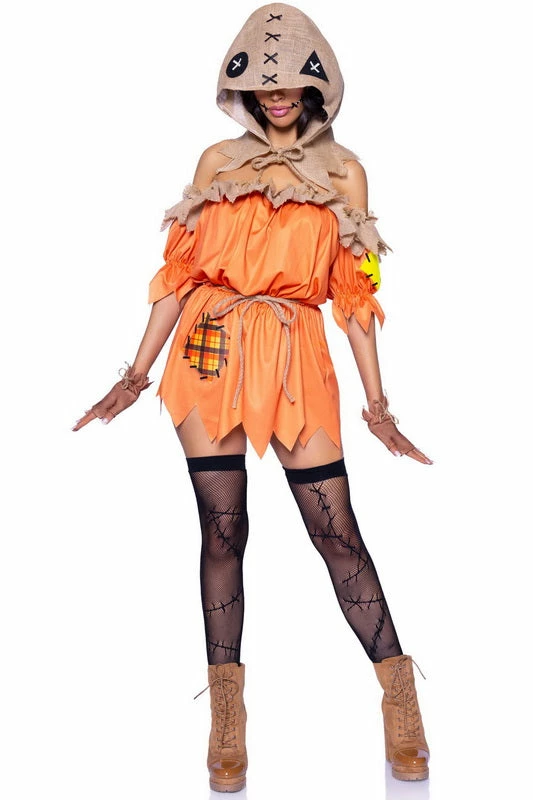 Dress for Halloween success with this 4-piece Spooky Trickster costume! The set includes a patchwork off the shoulder dress, rope belt, burlap hood, and fingerless gloves for a look inspired by Sam from Trick r Treat. Get creative and add face jewels and thigh highs (not included) to take your costume to the next level. Scare your friends and look amazing this Halloween!