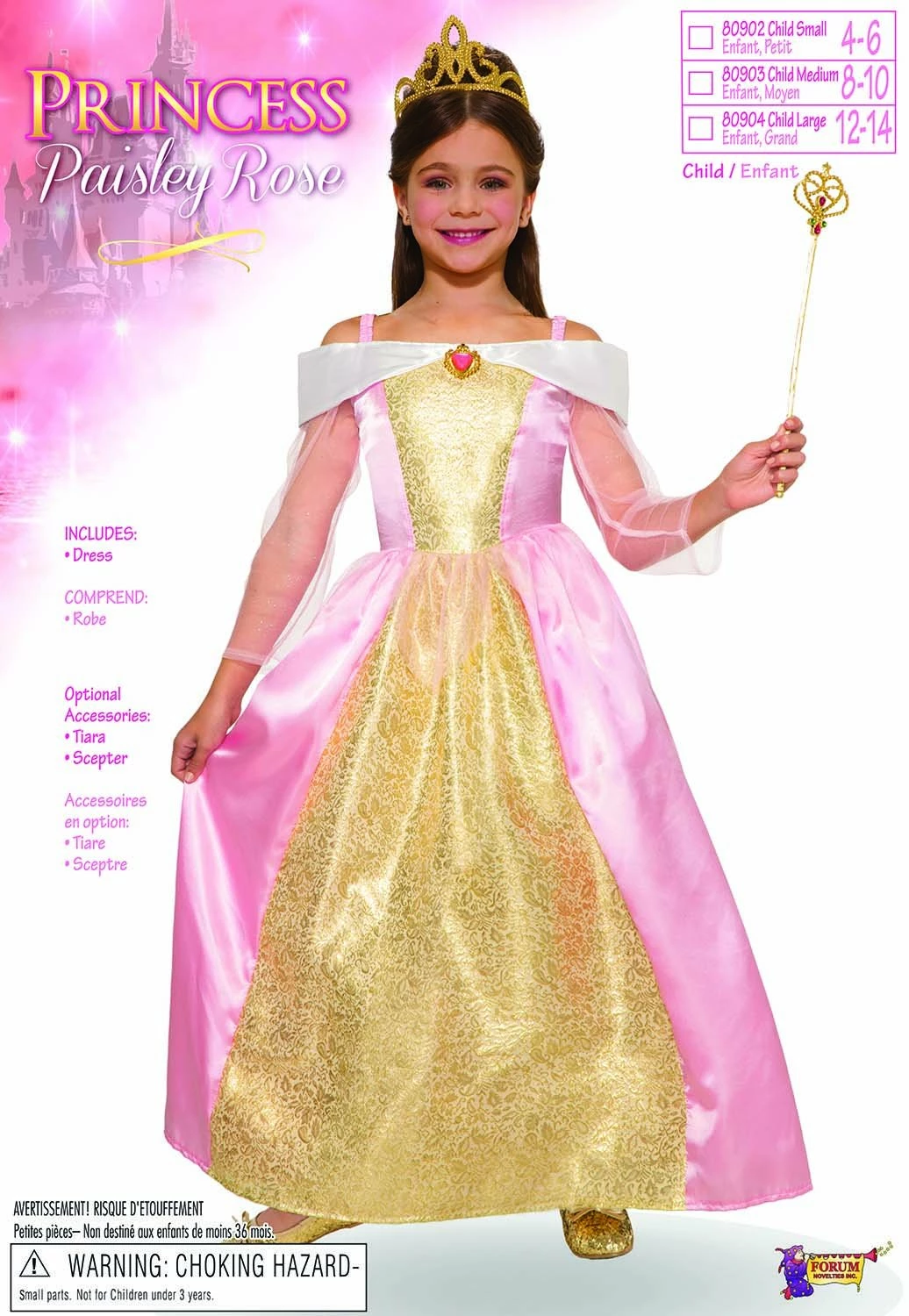 Have a royally good time in the Girls Princess Paisley Rose costume! You’ll feel like you can rule the world when you wear this floor-length pink and gold gown. Featuring a beautiful off shoulder pink princess gown with mesh sleeves and golden brocade detailing in the middle.